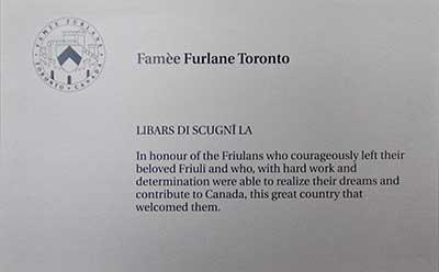 In Honour of the Friulans who courageously left their beloved Friuli and who, with hard work and determination were able to realize their dreams and contribute to Canada, this great country that welcomed them.